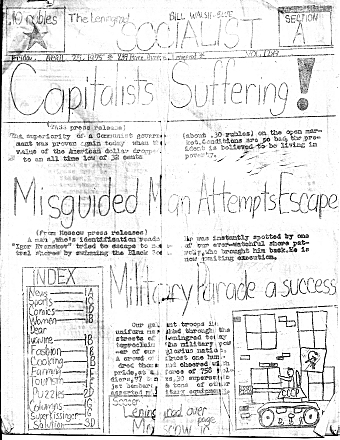 The Leningrad SocialistMy seventh-grade social-studies class was given a choice of assignments after our unit on the Soviet Union, one of which was to produce a Soviet newspaper. Here it is, from April 25, 1975. The full PDF file is huge, so try the individual page links unless you have a powerful computer with broadband and a lot of patience.
