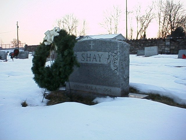 With daylight fading, we decided to check out Calvary Cemetery, over on the south side of town (maybe even in Mount Carbon). Some of the obits mentioned interment in the "crypt," so we looked for buildings. What appeared to be the mausoleum was locked, but right along the road nearby we immediately happened upon yet another lucky find -- Mae Shay's grave, complete with wreath.
