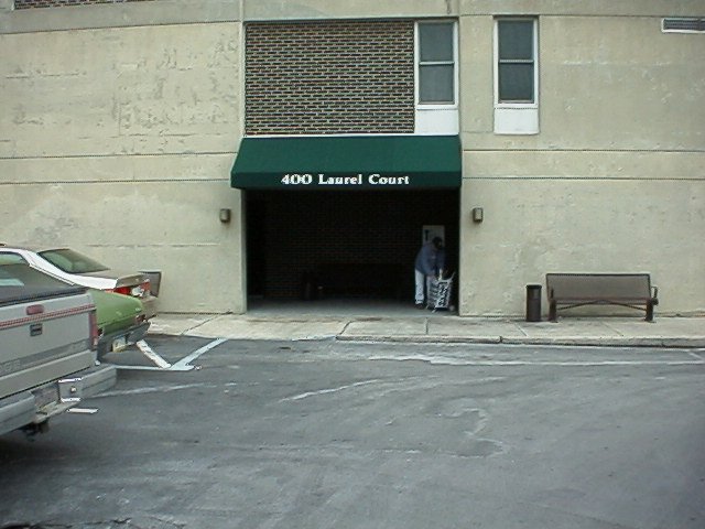 The same high-rise from the back, from the sidewalk in front of the jail.